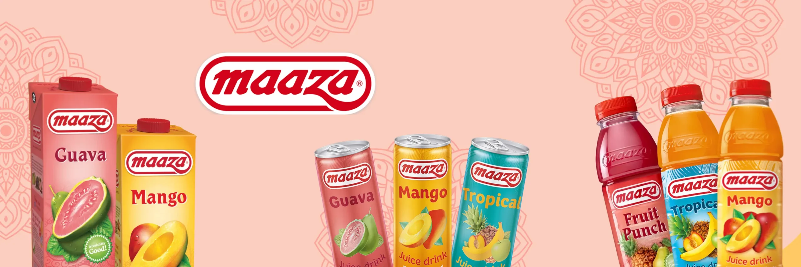 Visuel mettant en avant les boissons Maaza, une gamme de jus de fruits exotiques et rafraîchissants, parfaits pour un moment de plaisir fruité.
